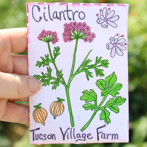 Plant these and care for them and you'll end up with a bumper crop of that delicious herb, cilantro! These seeds were harvested from plants grown at TVF, and feature custom-made seed packets colored in and assembled by a community member.