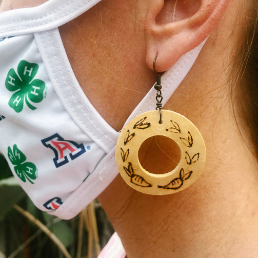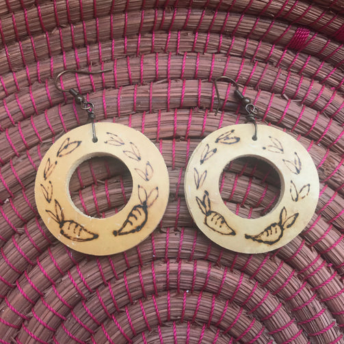 Handmade from gourds grown here at TVF! After drying out, the skin of a gourd is as strong as a light wood, which makes them great for repurposing into all sorts of neat stuff. We love making these earrings each year with our fall gourd harvest. Featuring nickel-free iron hooks, these are a perfect way to show your love for two of TVF's crops: gourds and carrots!