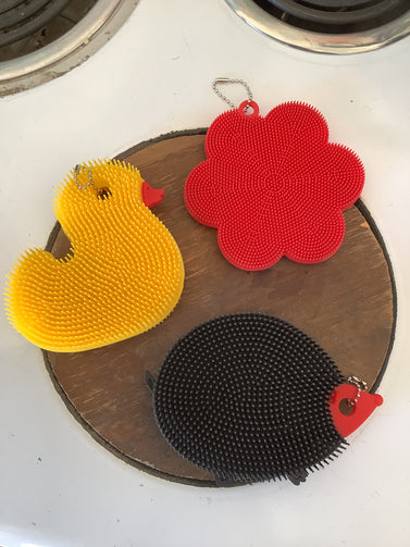 Say good bye to smelly sponges! These adorable brushes are made of sturdy silicone, and have dozens of micro bristles to ensure that you're able to wash all of the hard-to-reach places. Safe for nonstick, glass, enamel, stoneware and porcelain. Just drop in the dishwasher to clean. Choose from three different shapes: a hedgehog, a duck, or a flower.